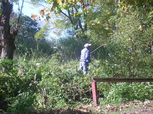En determinados casos los trabajadores del municipio se ven obligados a utilizar machetes de mano para poder desmalezar los arbustos que han crecido.